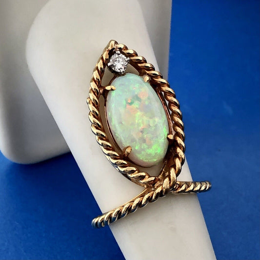 Custom Estate 18K Yellow Gold Oval Opal Diamond Accent Ichthys Statement Ring