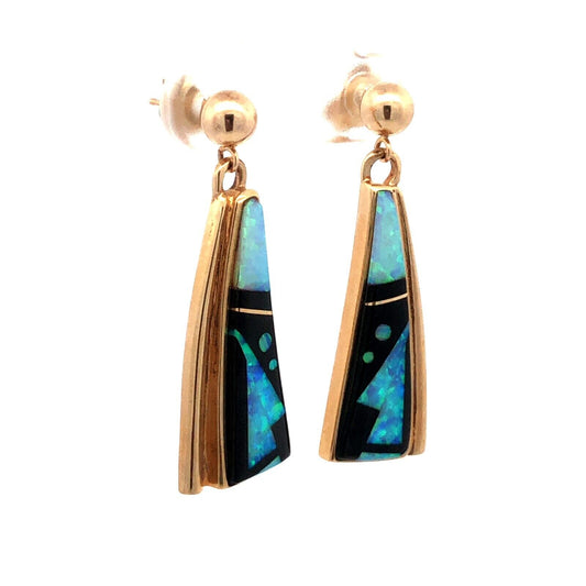 Calvin Begay Navajo 14K Yellow Gold Opal Onyx Storyteller Statement Earrings