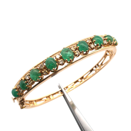 Designer 14k Yellow Gold Cabochon Emerald Diamond Hinged Cuff Bangle Bracelet