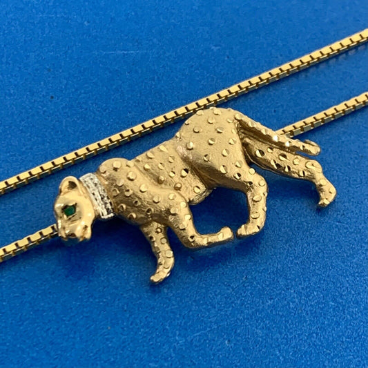 Custom 14K Yellow Gold Emerald Eye Spotted Leopard Pendant Necklace
