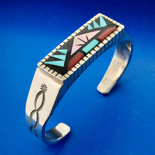 Rare Kee Montoya Navajo Sterling Silver Multi Gem Inlay Statement Cuff Bracelet
