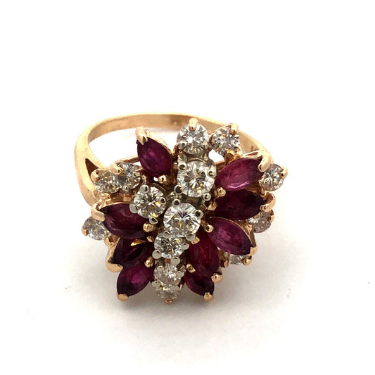 14K Yellow Gold Marquise Ruby Diamond Cluster Waterfall Ring