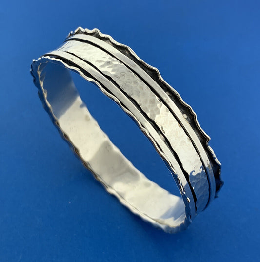 Retro Modernist Artisan 925 Sterling Silver Hammered 3D Spinner Bangle Bracelet