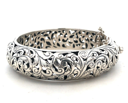 Designer HAN 925 Sterling Silver Etched Floral Scroll Hinged Bangle Bracelet