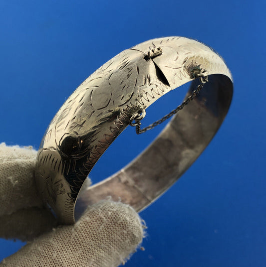 Art Nouveau Siam Sterling Silver Vermeil Etched Scroll Hinged Bangle Bracelet