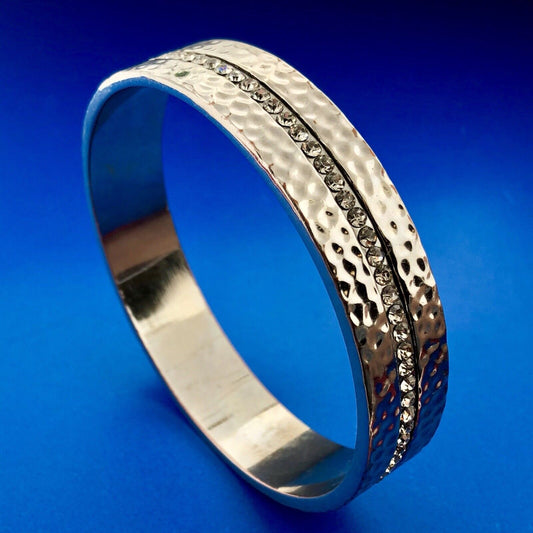 Designer Silver Tone Cubic Zirconia CZ Hammered Statement Bangle Bracelet