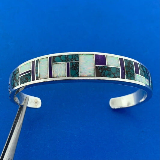 C Willie/D Rosales Sterling Silver Opal Spiderweb Turquoise Amethyst Inlay Cuff