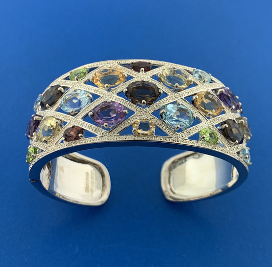 Designer Sterling Silver Multicolor Oval Quartz Statement Hinged Cuff Bracelet