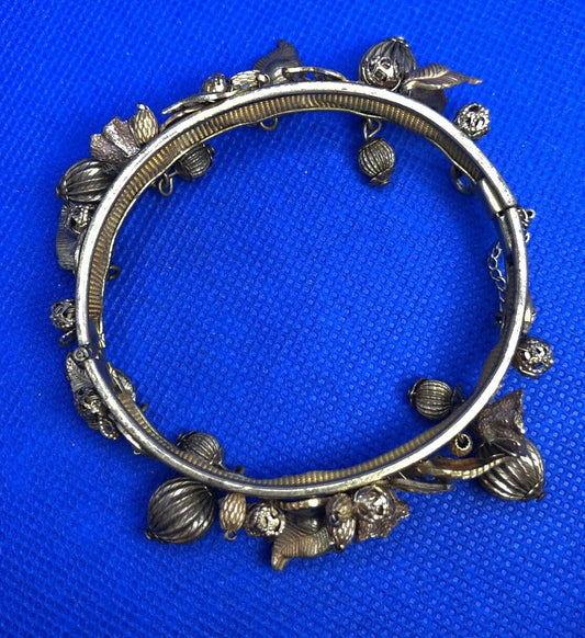 Art Nouveau Gold Tone Floral Theme Dangle Charm Hinged Cuff Bracelet