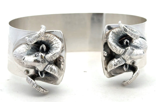 Artisan 925 Sterling Silver Ram's Head Aries Zodiac Statement Open Cuff Bracelet