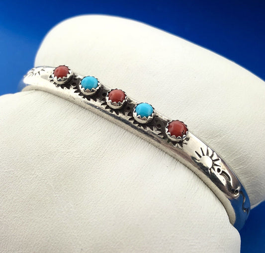 LAG-ZUNI JP Artisan Sterling Turquoise Coral Petite Storyteller Cuff Bracelet