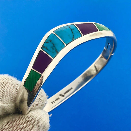 Vintage Taxco Signed 925 Sterling Silver Multi Gem Inlay Hinged Cuff Bracelet