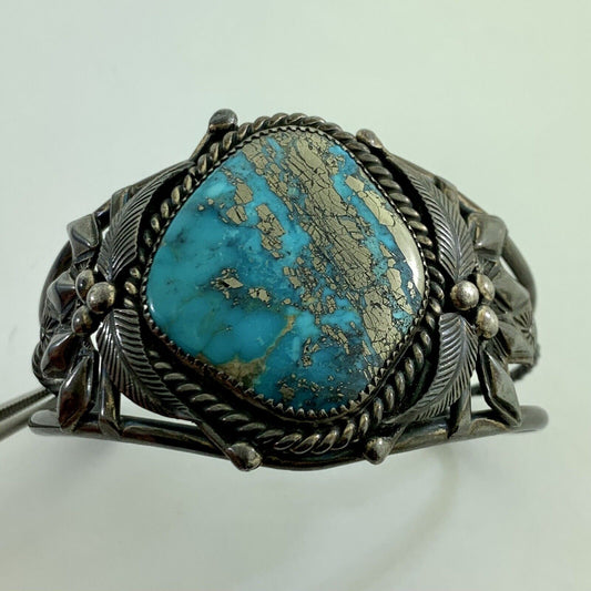 Signed Native American Sterling Silver Turquoise Statement Open Cuff Bracelet
