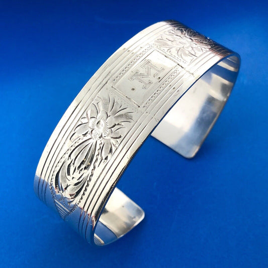 Victorian Edwardian 925 Sterling Silver Etched Floral Monogram M Cuff Bracelet