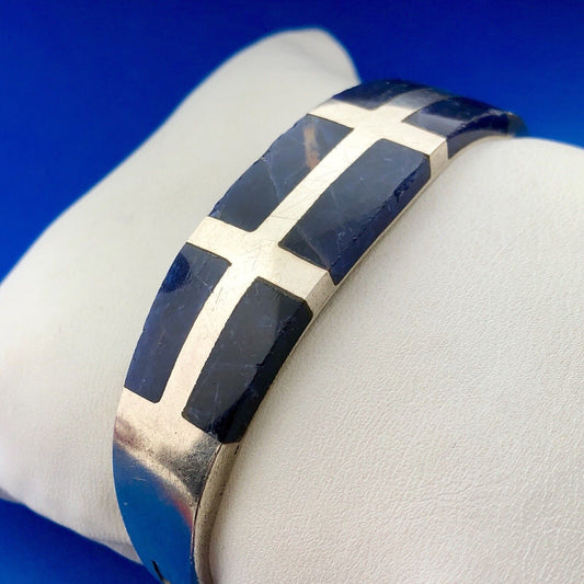 Retro Taxco Artisan 925 Sterling Silver Lapis Lazuli Inlay Hinged Cuff Bracelet