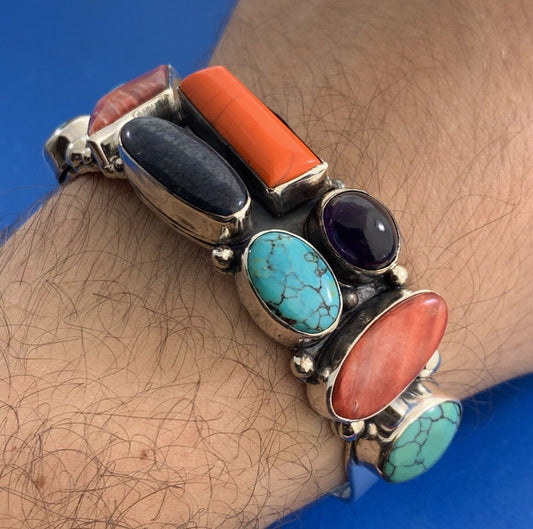 Rare Kee Montoya Navajo Sterling Silver Multi Gem Inlay Statement Cuff Bracelet