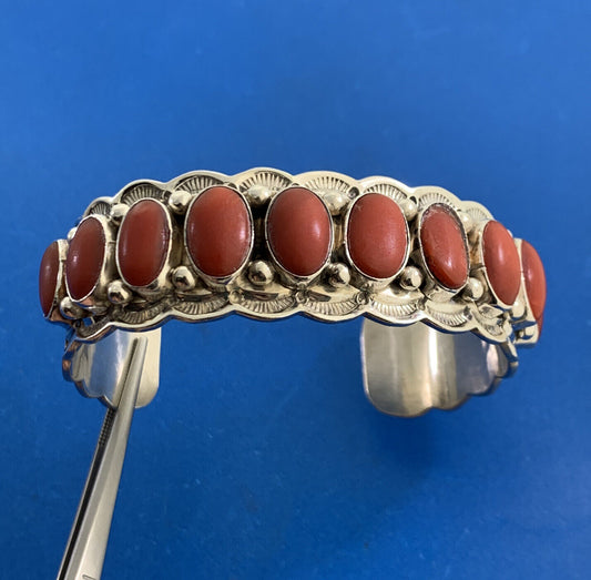 Aaron Toadlena Native American 925 Sterling Silver Coral Statement Cuff Bracelet