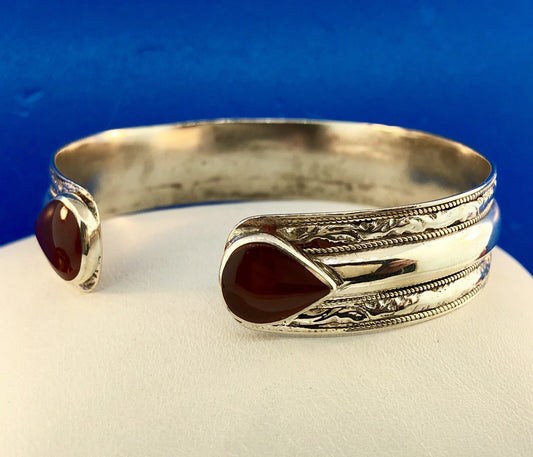 Vintage Artisan 950 Silver Red Carnelian Ribbed Bead Work Scroll Cuff Bracelet