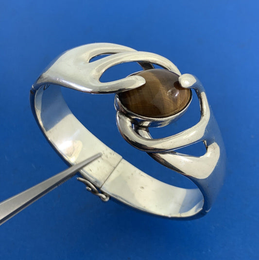 Sigfrido Pineda Taxco Modernist Sterling Silver Tigers Eye Hinged Cuff Bracelet