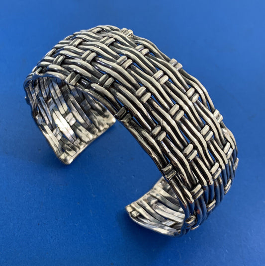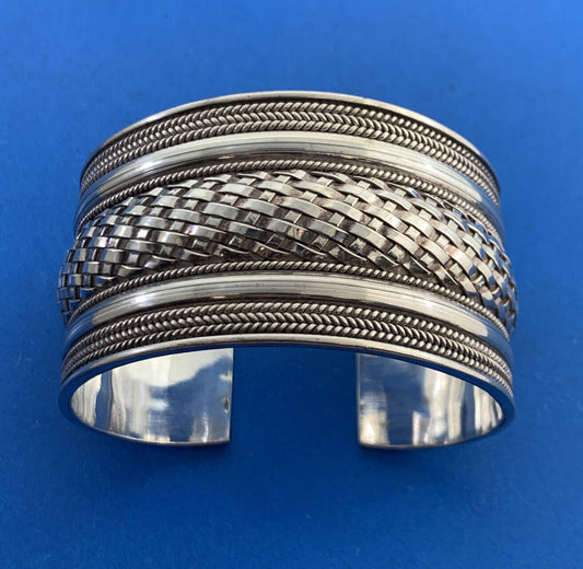 Artisan 925 Sterling Silver Basket Weave Statement Open Cuff Bracelet
