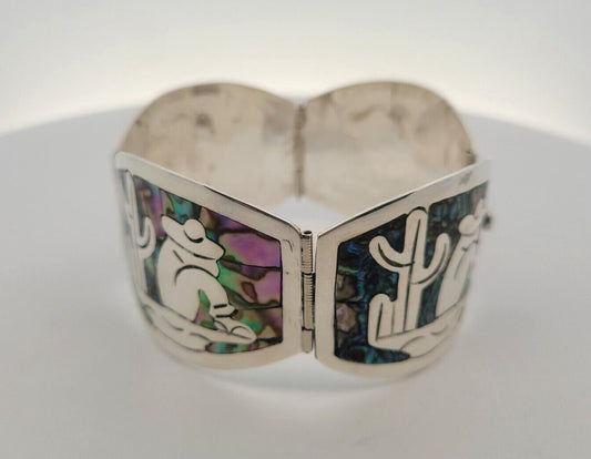 Vintage Mexico Taxco CS Sterling Silver Abalone Inlay Oval Panel Cuff Bracelet