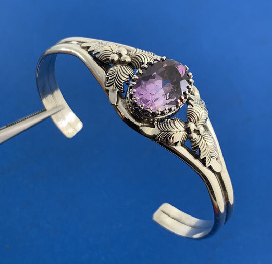 Vintage Native American E D 925 Sterling Silver Oval Amethyst Cuff Bracelet