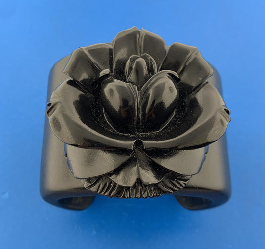 Mid Century Chunky Carved Black Lucite Rose Flower Statement Cuff Bracelet