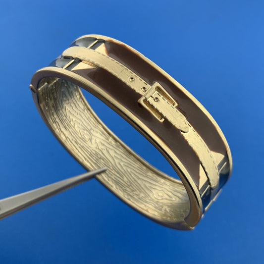 1980's Gold Tone Black Brown Gold Enamel Belt Buckle Design Hinged Cuff Bracelet
