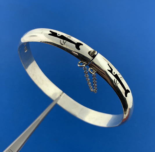 Estate Taxco Mexico Sterling Silver Modernist Etched Fish Hinged Cuff Bracelet