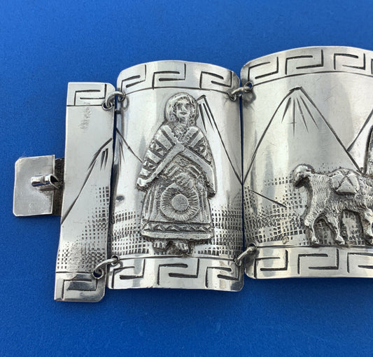Vintage Peru 900 Silver Aborigine Storyteller Statement Panel Cuff Bracelet