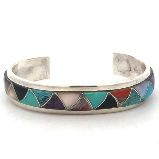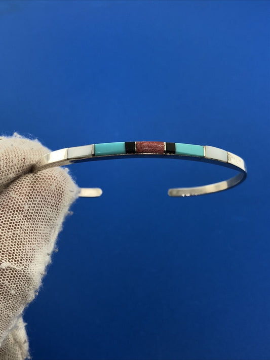 Native American PA 925 Sterling Silver Multi Gem Inlay Petite Cuff Bracelet