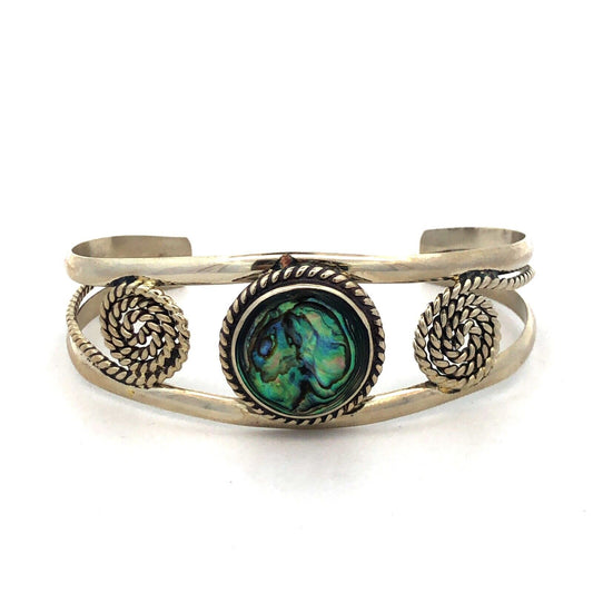 Vintage Mexico Alpaca 925 Sterling Silver Round Abalone Filigree Cuff Bracelet