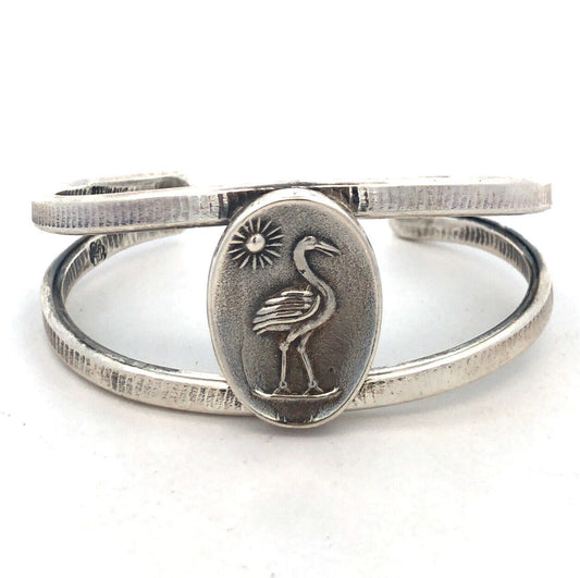 Designer 925 Sterling Silver Heron Crane Bird Sun Oval Open Cuff Bracelet