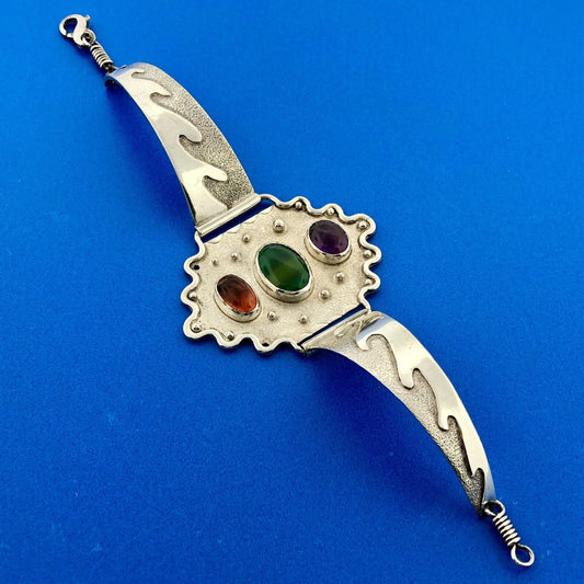 Native American Sterling Silver Amber Amethyst Green Tourmaline Cuff Bracelet