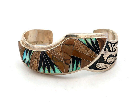 Calvin Begay Sterling Silver Mixed Gemstone Inlay Open Storyteller Cuff Bracelet