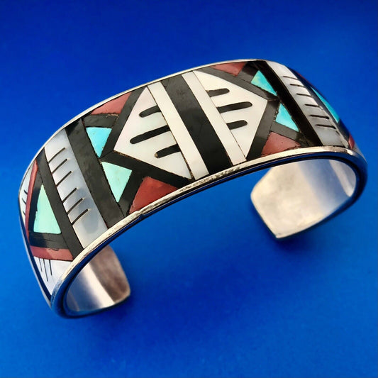Native American Signed 925 Sterling Multi Stone Inlay Statement Cuff Bracelet