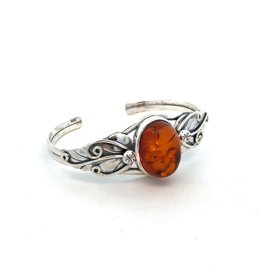 Vintage 925 Sterling Silver Oval Amber Leaves Nature Cuff Bracelet