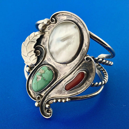 Sterling Silver 925 Mother Of Pearl Turquoise Coral Squash Blossom Cuff Bracelet