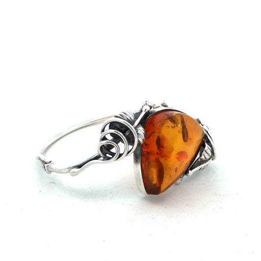 Vintage 925 Sterling Silver Trillion Amber Cabochon Hinged Vine Cuff Bracelet