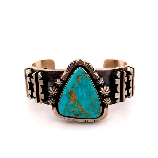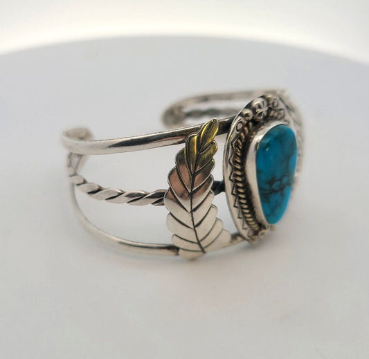 Native American 925 Sterling Silver Turquoise Cabochon Floral Open Cuff Bracelet