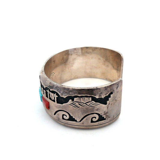 Alvin Begay Navajo 925 Sterling Silver Turquoise Coral Storyteller Cuff Bracelet