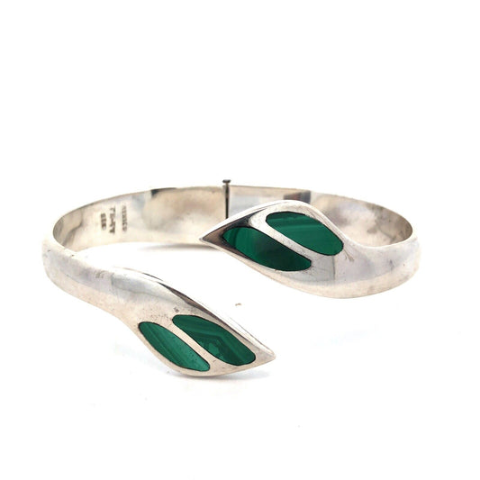 Mid Century Taxco Sterling Silver Malachite Inlay Modernist Hinged Cuff Bracelet