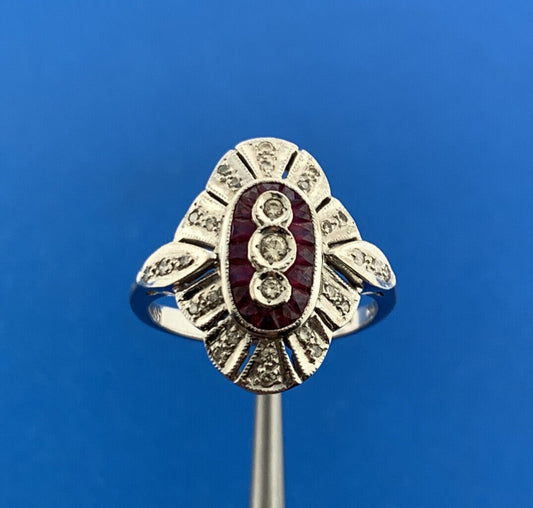 14K White Gold Art Deco WMJ Ruby Diamond Accented Engagement Cocktail Ring