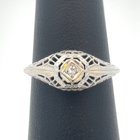 Vintage Designer Art Deco 18K White Gold Diamond Filigree Engagement Ring