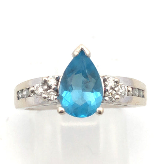 Designer 14K White Gold Pear Blue Topaz Round Diamond Engagement Size 7 Ring