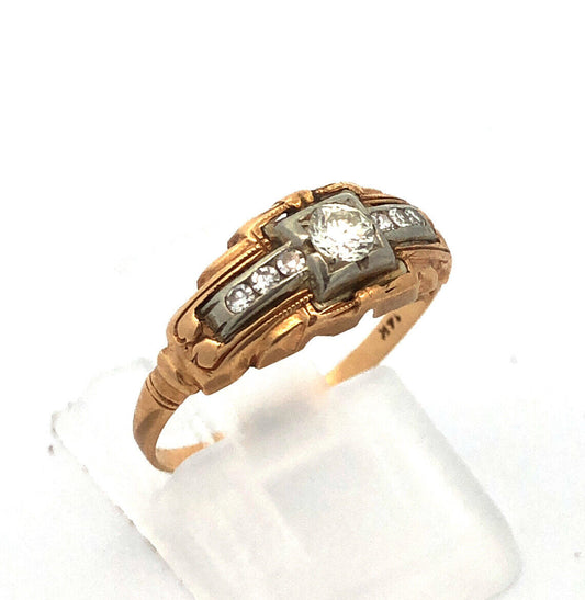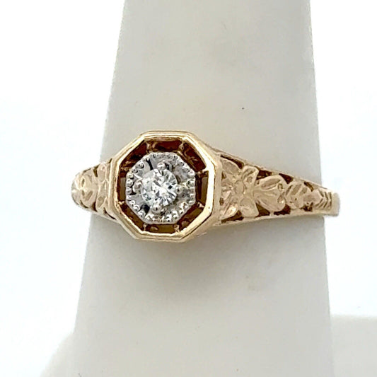 Art Deco 14K Yellow Gold Round Diamond Engagement Anniversary Ring