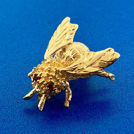 14K Yellow Gold Ruby Eyes Bee Pendant Flying Bug Vintage Lapel Scarf Pin