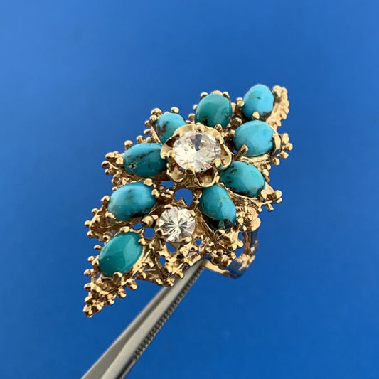 14K Yellow Gold Turquoise White Quartz Cluster Free Form Statement Cocktail Ring