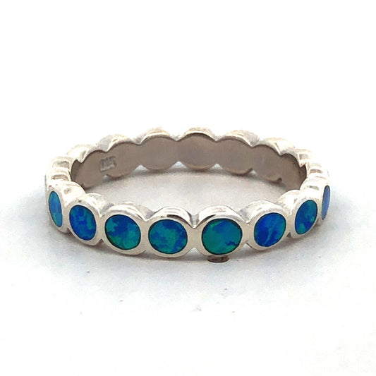 925 Sterling Silver Round Blue Opal Inlay Bubble Stackable Band Ring