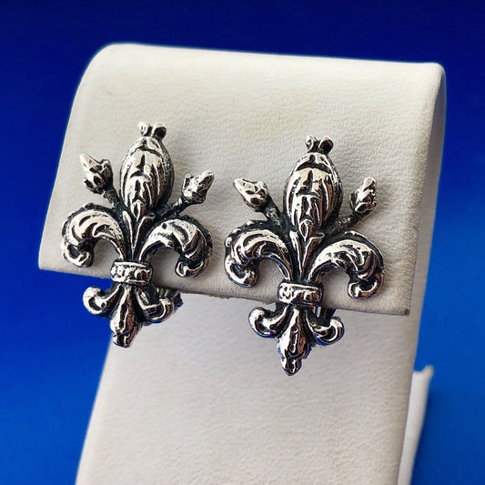 Antique 800 Fine Silver Detailed Artisan Fleur De Lis Clip On Stud Earrings